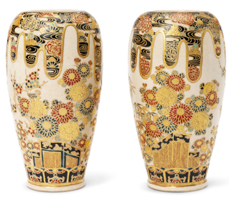 A pair of Imperial style Satsuma vases, Satsuma yaki Satsuma no kuni Ijuin Naeshirogawa Kessengyoku, Meiji period (late 19th century)