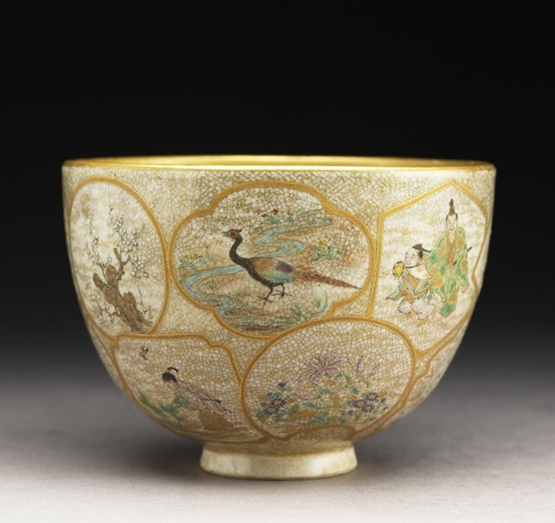 Decorations in early Meiji imitated those of Kagoshima, which were generally simple representations of nature - birds and flowers (kacho-ga); blossoms with butterflies or other insects, and floral bouquets, set off by surrounding white space and limited nishikide (diaper or brocade) designs. Soon, these were joined by figures of mythical animals, such as the phoenix (ho ho), lion dog (shi shi) and kirin. Human figures drawn from Japanese mythology and history also followed, including various deities and their acolytes (rakan). Decoration often left surrounding white space, like the Kagoshima originals. Clouds of stippled gold dots (‘gold dust’) were commonly used to frame the subject and set off the white space.