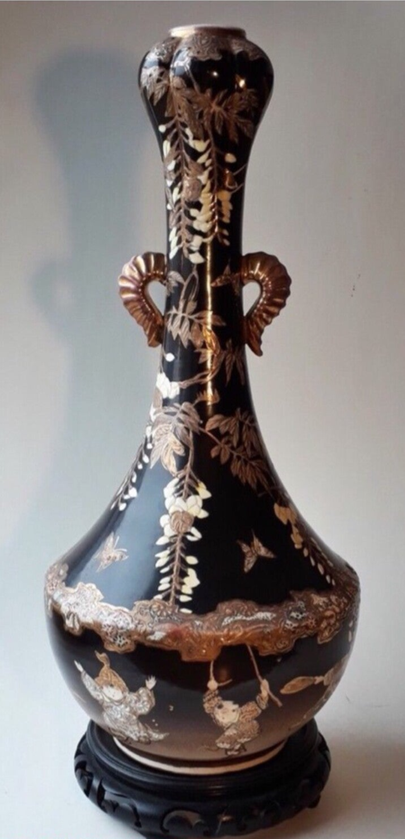 Kinkōzan vase with playing karako's and wisteria on chocolate brown groun.