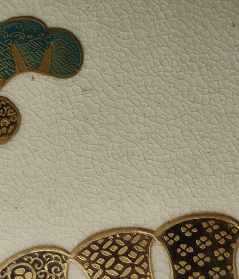 Fine crackles in the glaze are a characteristic of good quality Satsuma pottery, regardless of the age. Sometimes these crackles are so fine that you hardly can see them. Good quality glaze should be pale in colour on a whitish or ivory paste, which gives a pale honey or honey colour to the crackles themselves.